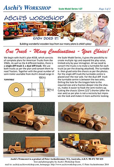 | One of the most versatile plan from Aschi's Workshop is the Plan #158. In Scale 1:27 it is not to big and easy to build. The Plan #158 has on his ohn already 4 different trucks, using this FREE PLAN for an conversion to an Tractor-Trailer extendes the posibilities to create your favorite combination of Truck n'Trailer. Get it today from Aschi's Workshop.... is FREE !!! |